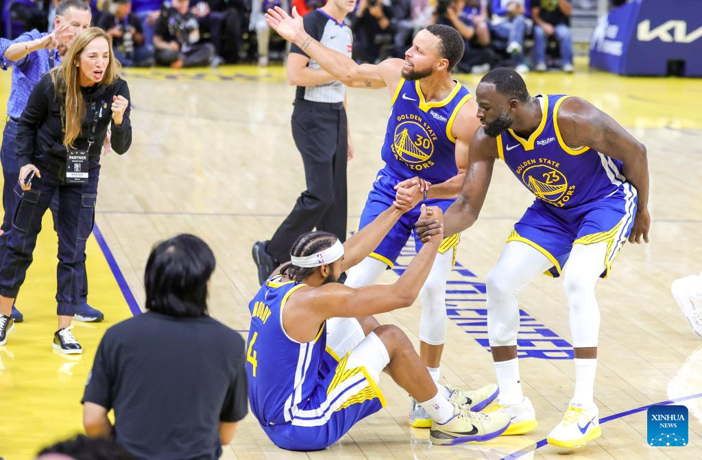 Stephen Curry (2nd R) and Draymond Green (1st R) of Golden State Warriors help teammate Moses Moody (3rd R) get up during the 2025-2026 NBA regular season match between Golden State Warriors and Memphis Grizzlies in San Francisco, the United States, on Oct. 27, 2025. (Photo by Arthur Dong/Xinhua)