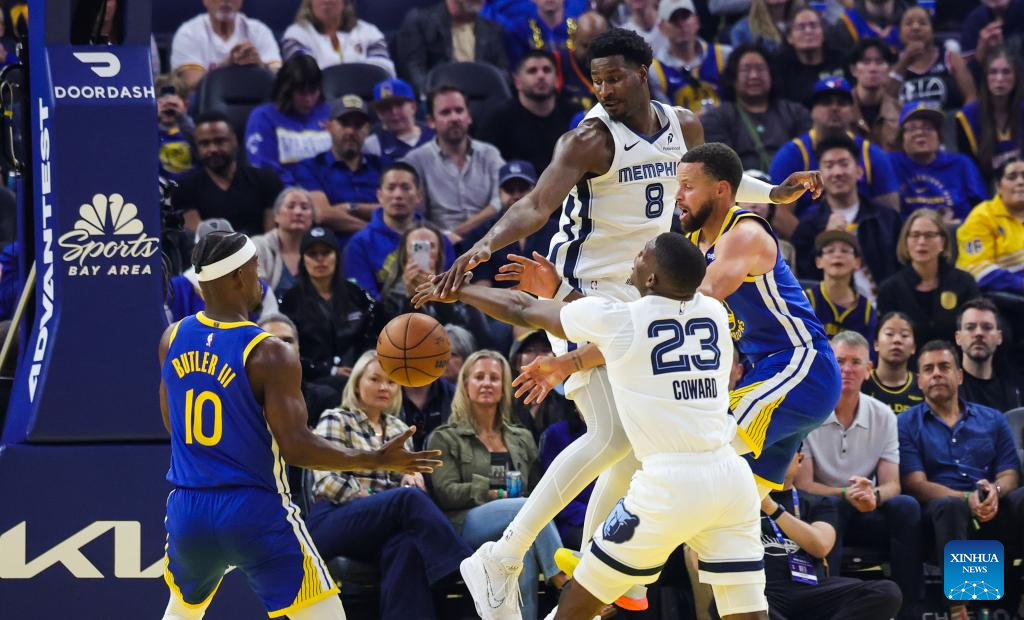 Stephen Curry (1st R) and Jimmy Butler III (1st L) of Golden State Warriors fight for the ball with Jaren Jackson Jr. (top) and Cedric Coward of Memphis Grizzlies during the 2025-2026 NBA regular season match between Golden State Warriors and Memphis Grizzlies in San Francisco, the United States, on Oct. 27, 2025. (Photo by Arthur Dong/Xinhua)