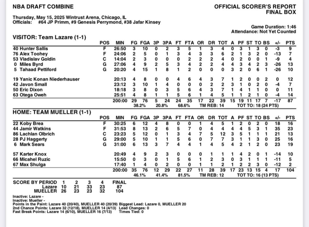 Oweh finished with 14 points (4-8 FG, 1-1 3PT, 5-6 FT), five rebounds, one assist, two steals, and one turnover in 26 minutes for Team Lazare. But his effort wasn’t enough to overpower Brea and Team Mueller, which picked up the 104-87 victory. Brea was much improved from his subpar shooting outing the day prior. He was credited with 16 points (6-12 FG, 4-8 3PT), five rebounds, one assist, and two turnovers in 30 minutes.