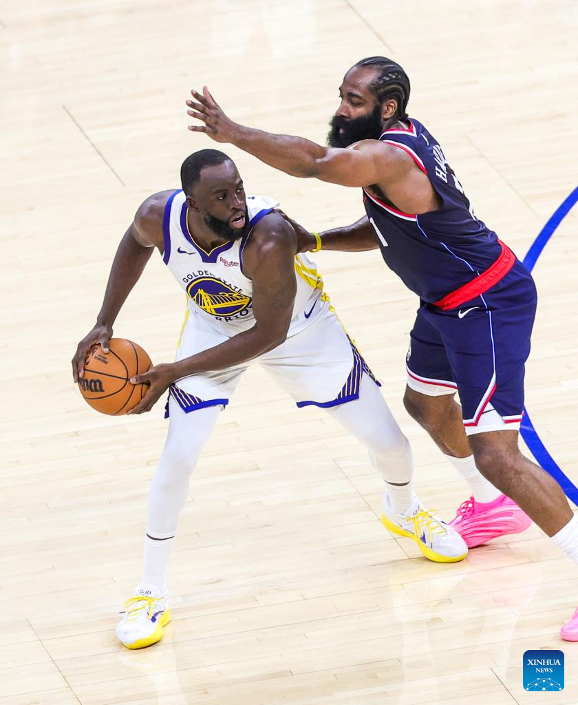 Draymond Green (L) of Golden State Warriors breaks through against James Harden of Los Angeles Clippers during the 2025-2026 NBA regular season match between Golden State Warriors and Los Angeles Clippers in San Francisco, the United States, on Oct. 28, 2025. (Photo by Arthur Dong/Xinhua)