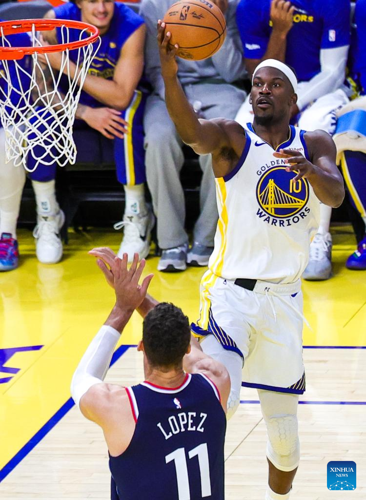 Jimmy Butler III (top L) of Golden State Warriors breaks through during the 2025-2026 NBA regular season match between Golden State Warriors and Los Angeles Clippers in San Francisco, the United States, on Oct. 28, 2025. (Photo by Arthur Dong/Xinhua)