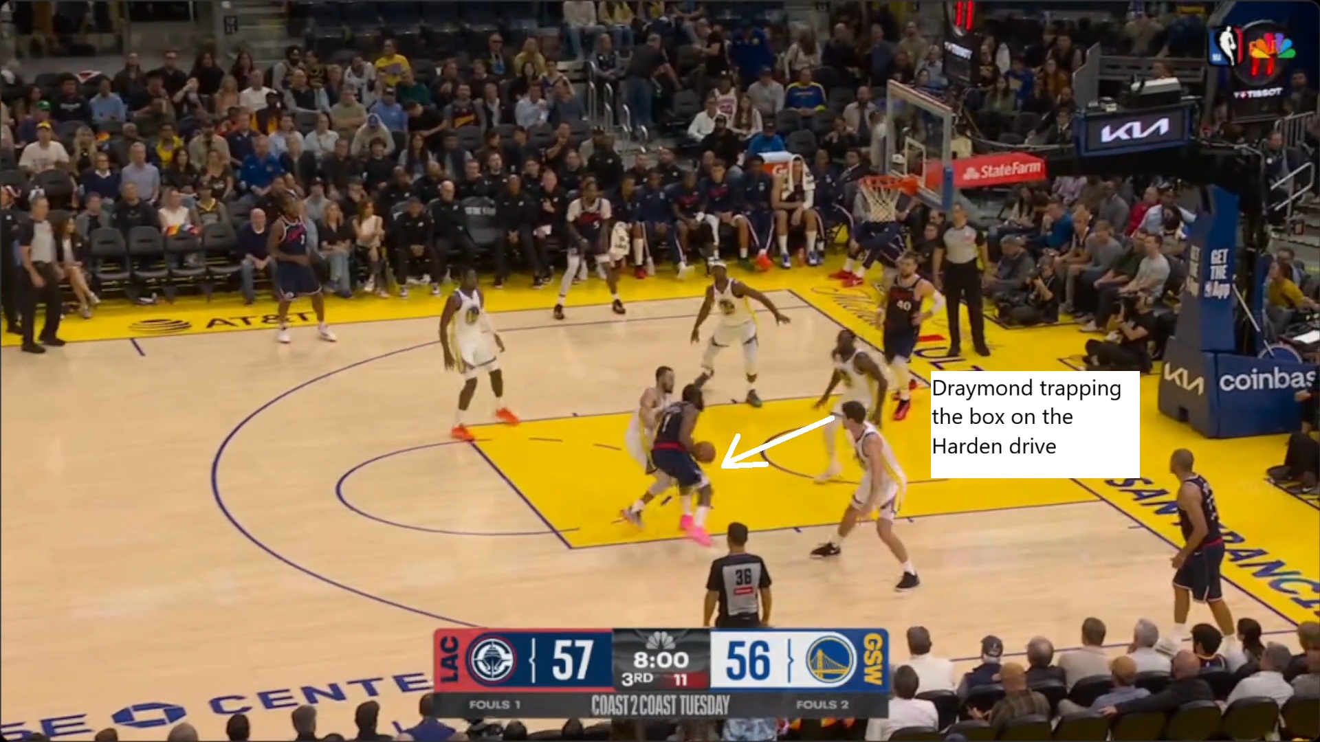 Coupled with Kuminga and his high pick-up points that immediately put a modicum of pressure on Harden before the half-court mark, the Warriors were successful at wresting control from Harden’s clutches and living with shots they would rather give up — such as a Derrick Jones Jr. corner three, a shot opened by Brandin Podziemski tagging the roll and Harden once again being “weaked” toward his right.