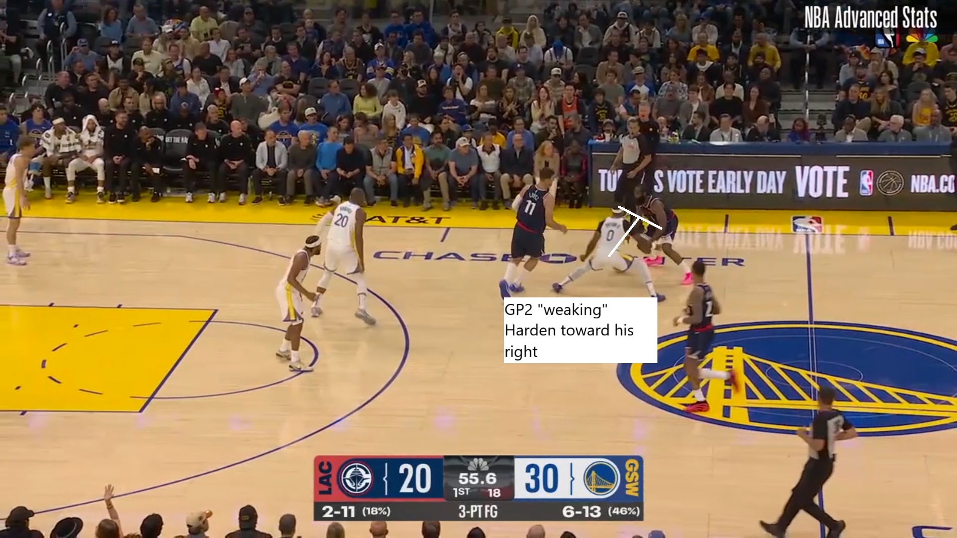 When it seemed like the Golden State Warriors would maintain one of their patented hot starts against the Los Angeles Clippers, things quickly fell apart, mostly due to the exploits of an old nemesis in James Harden. The Warriors possess arguably the greatest amount of institutional knowledge of how to “contain” Harden, data collected from their many battles with prime Harden and his time with the Houston Rockets. Even with that knowledge in hand, Harden was able to score 20 points in the first half, on 6-of-12 shooting and a perfect 7-of-7 at the free-throw line.