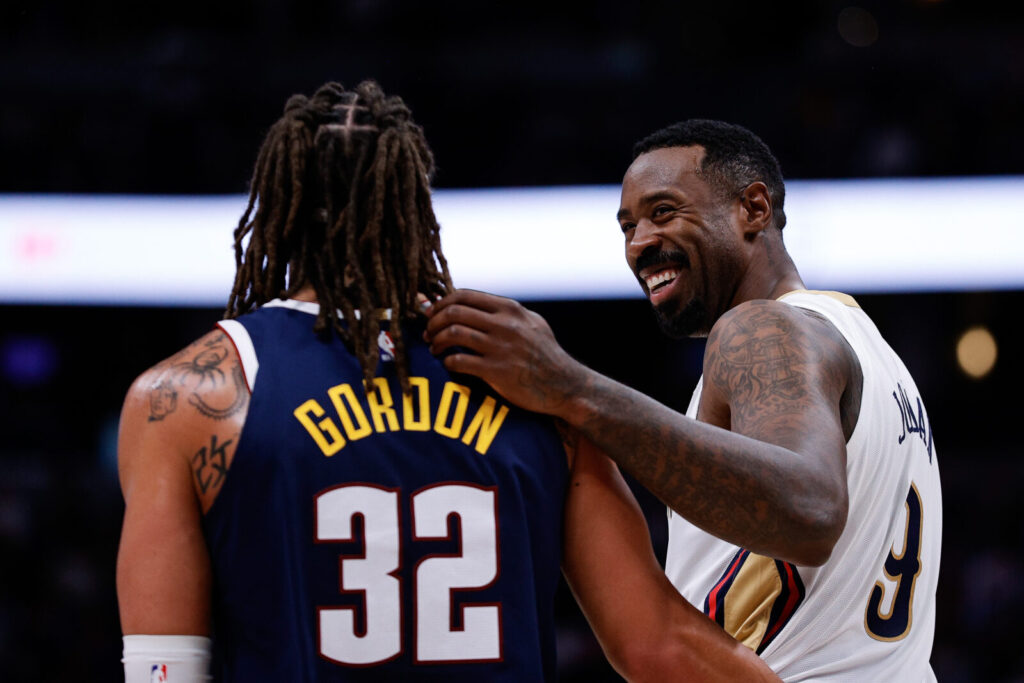 Oct 29, 2025; Denver, Colorado, USA; New Orleans Pelicans center DeAndre Jordan (9) talks with Denver Nuggets forward Aaron Gordon (32) in the second quarter at Ball Arena. Mandatory Credit: Isaiah J. Downing-Imagn Images