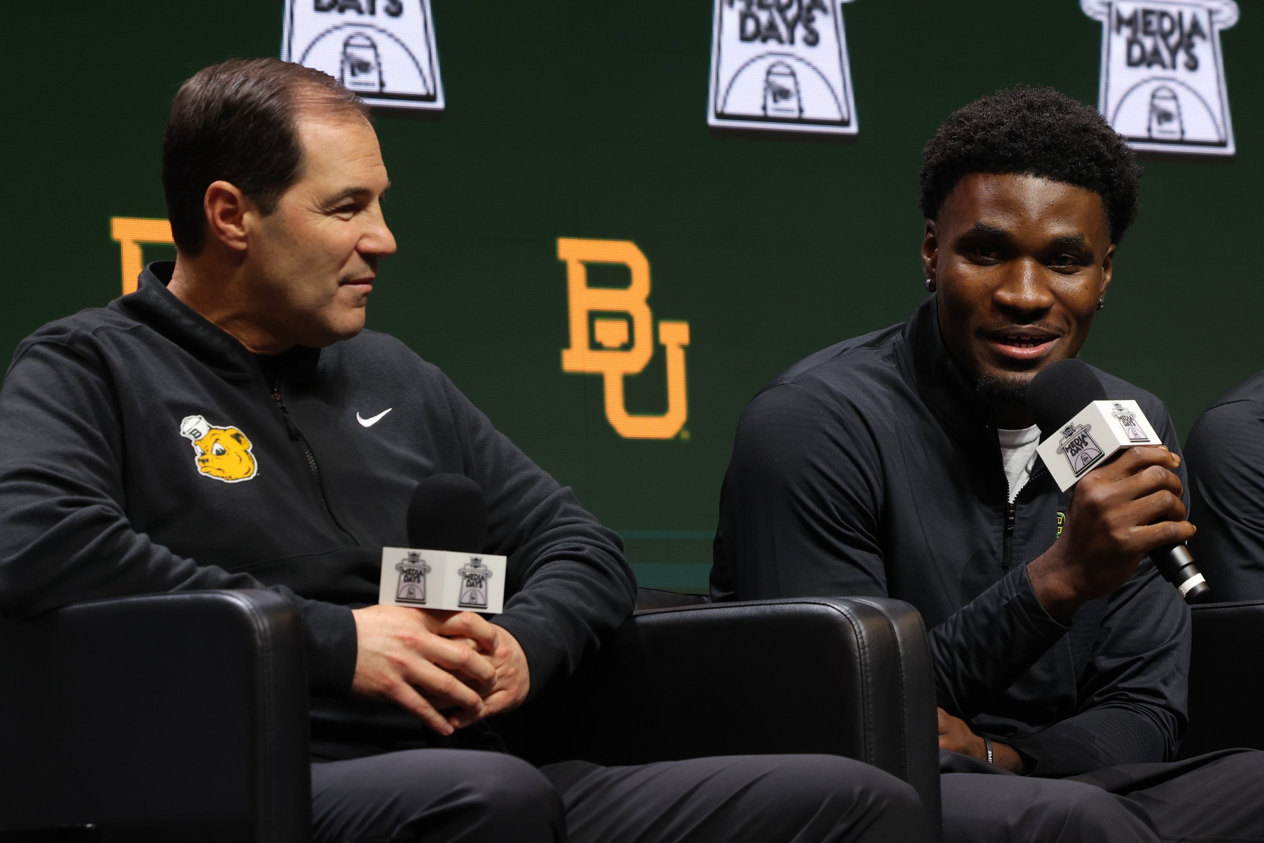 Oct 22, 2025; Kansas City, MO, USA; Baylors Tounde Yessoufou (right) speaks to media alongside head coach Scott Drew during Big 12 Mens Basketball media day at T-Mobile Center. Mandatory Credit: Sophia Scheller-Imagn Images