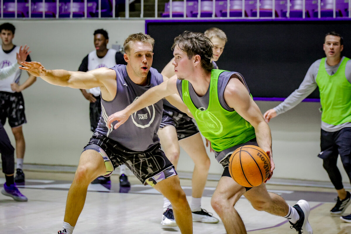 Weber State guard Brady Smith, right, drives the ball during a drill against Jace Whiting on Oct. 8, 2025, at the Dee Events Center in Ogden.