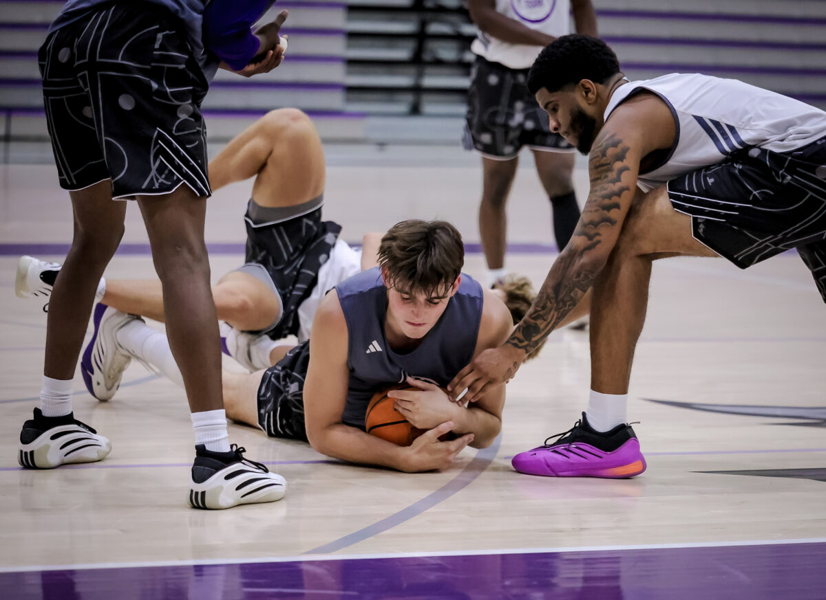 Weber State forward David Hansen, center, dives on the floor to grab the ball while Edwin Suarez Jr., right, reaches in during practice Sept. 22, 2025, at Swenson Gym in Ogden.