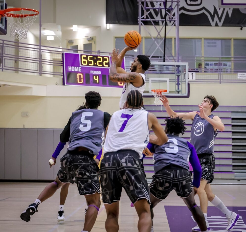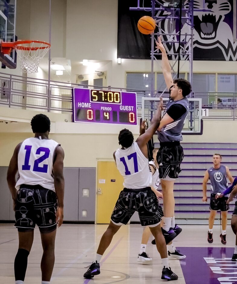 Weber State forward Edwin Suarez Jr. rises above a crowd to shoot a basket during practice Sept. 22, 2025, at Swenson Gym in Ogden.