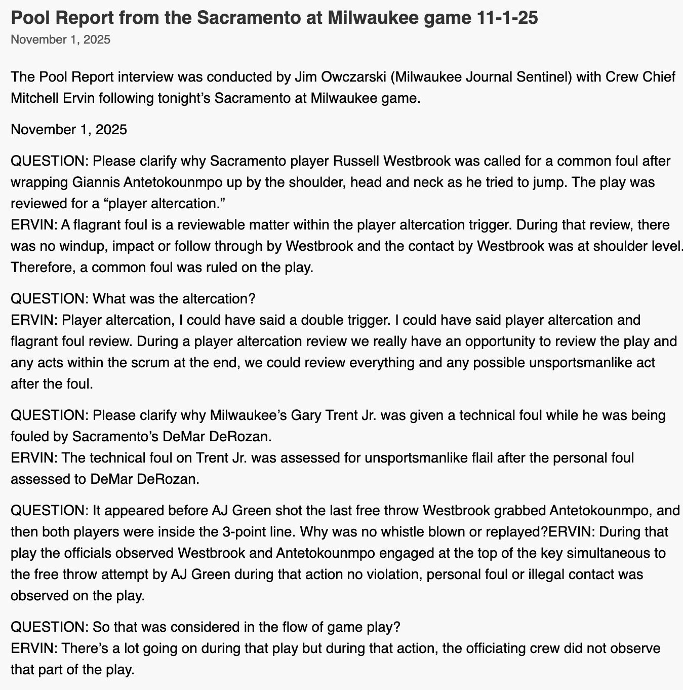 Jim Owczarski of the Milwaukee Journal Sentinel conducted the Pool Report interview with crew chief Mitchell Ervin to talk about several of the controversial calls that were or weren’t made tonight. Here is a full transcript of the report: