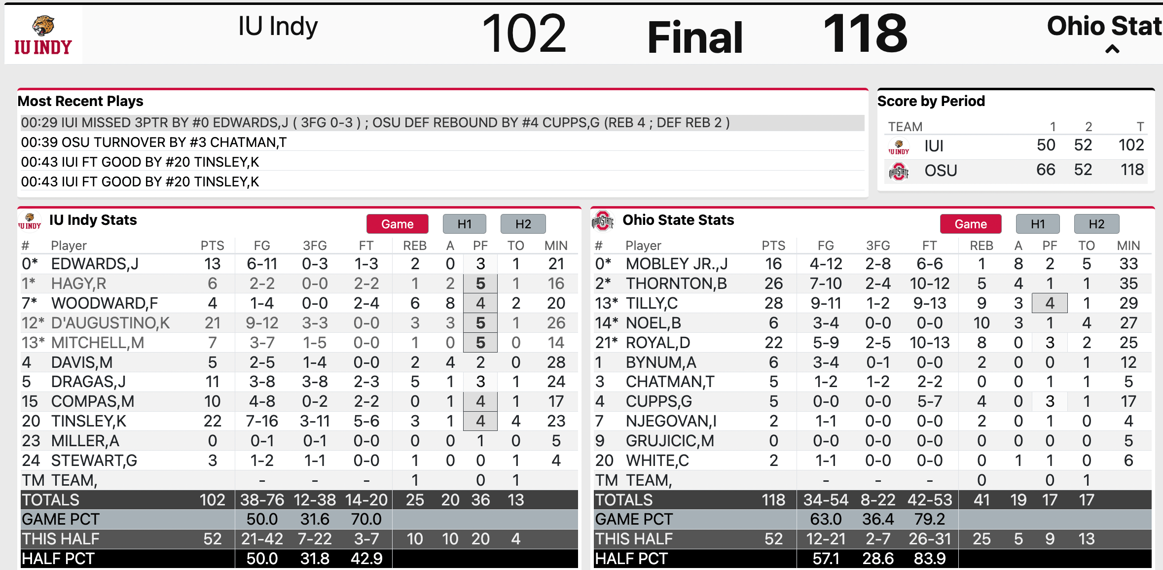 IU Indy never got it closer than 10 in the second half, but the game was also never quite in the bag for the Buckeyes, as they eclipsed the 100-point mark and then some in a 118-102 opening night win over the Jaguars.