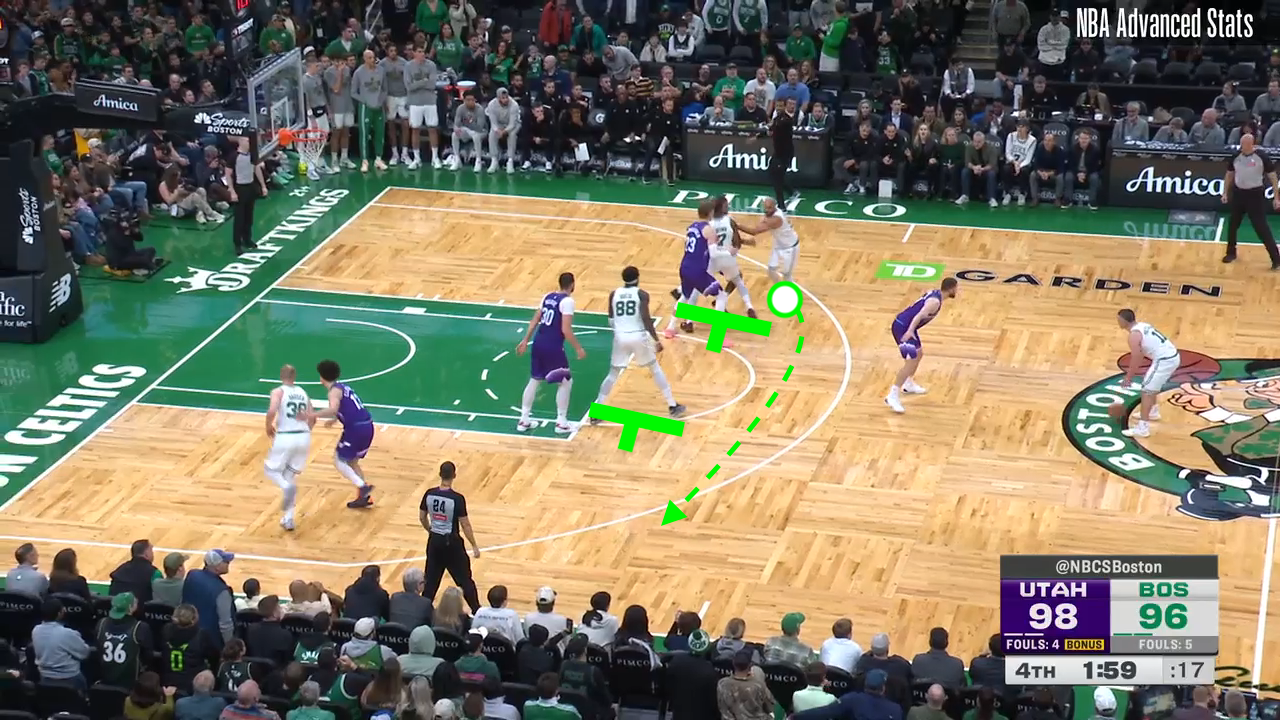 On this first play, the Jazz force a switch and keep Queta away from the rim. Once Fillipowski receives the ball and sees no rim protection, he drives and finishes.