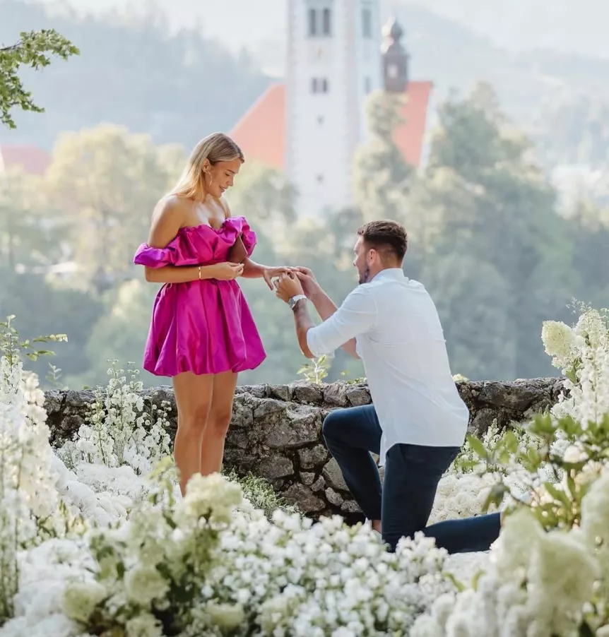 Luka Doncic proposed to Anamaria on July 7, 2023, during a romantic trip to the beautiful Lake Bled in Slovenia. He chose the date to align with his jersey number, 77. He got down on one knee in a white shirt and blue pants, and she looked like a princess in a purple off-the-shoulder mini dress. The couple announced the engagement with a joint Instagram post, captioned with the date “7.7” alongwith emojis of a ring and a red heart.