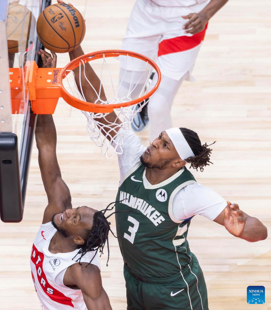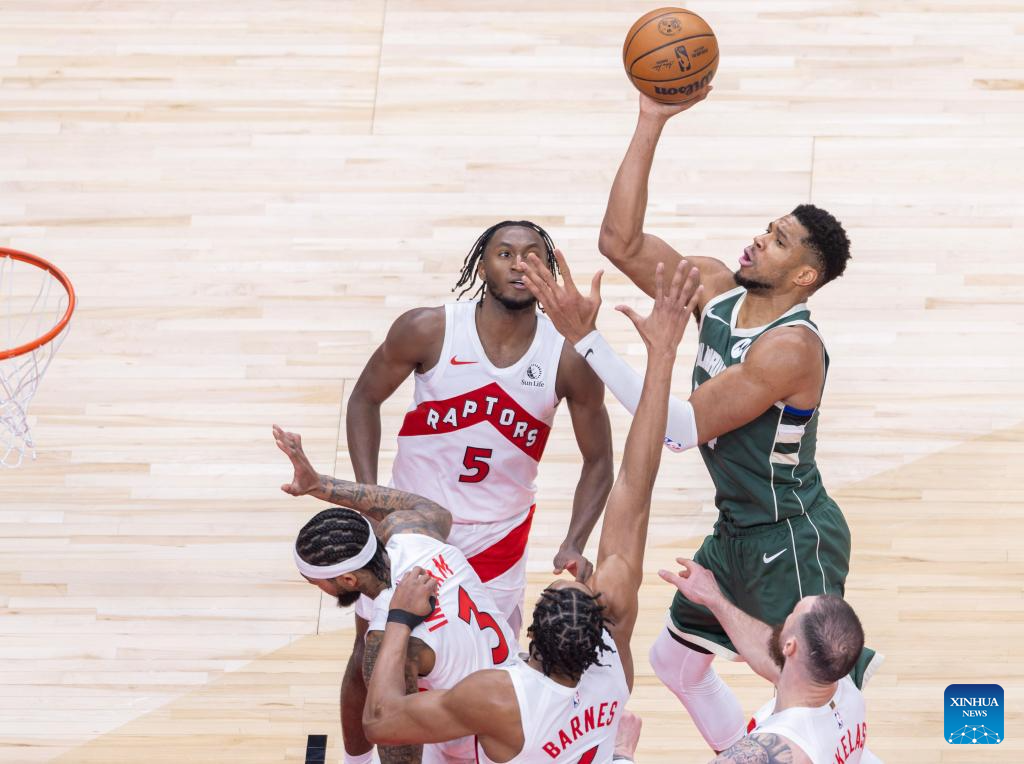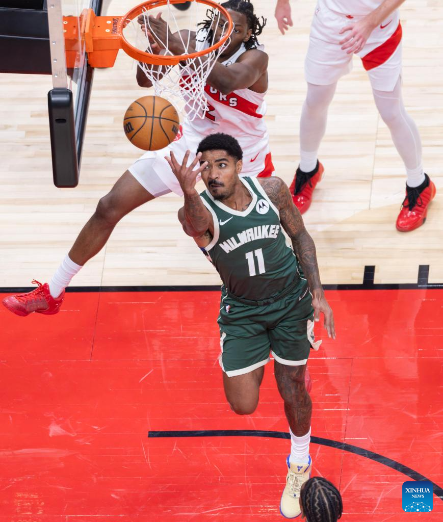 Giannis Antetokounmpo (R) of Milwaukee Bucks goes for a layup during the 2025-2026 NBA regular season match between Toronto Raptors and Milwaukee Bucks in Toronto, Canada, on Nov. 4, 2025. (Photo by Zou Zheng/Xinhua)
