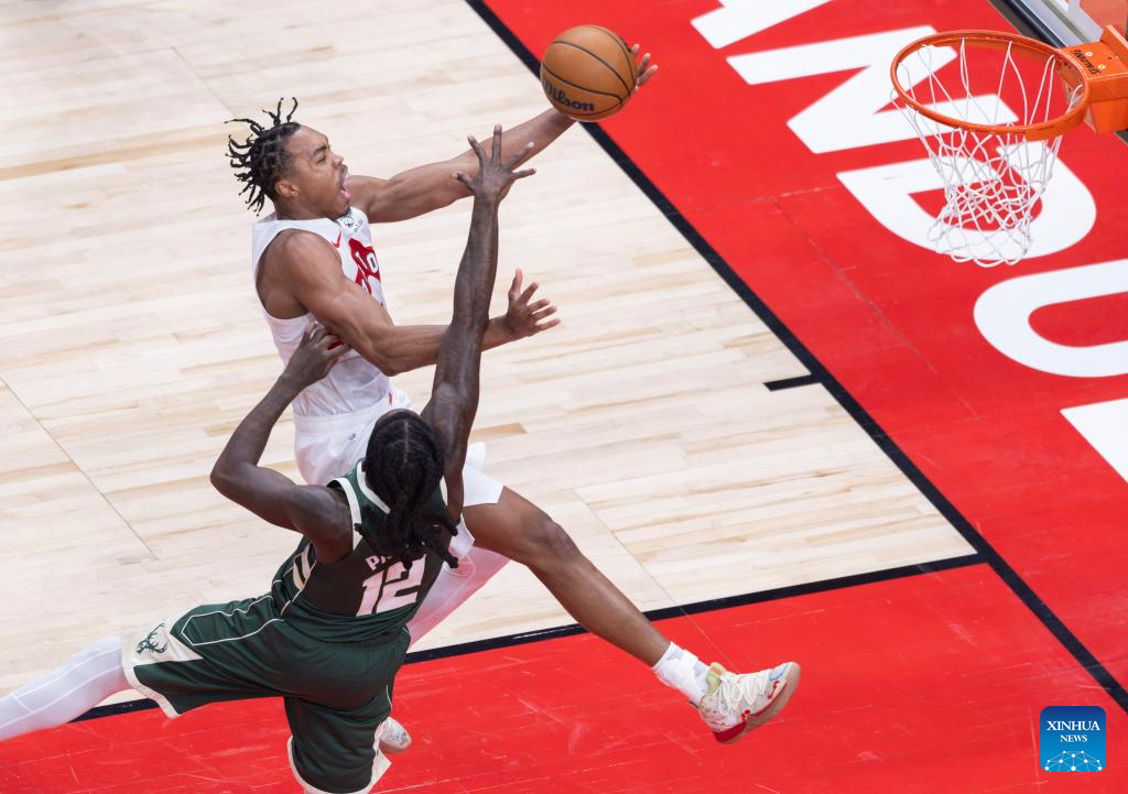 Scottie Barnes (back) of Toronto Raptors goes for a layup during the 2025-2026 NBA regular season match between Toronto Raptors and Milwaukee Bucks in Toronto, Canada, on Nov. 4, 2025. (Photo by Zou Zheng/Xinhua)