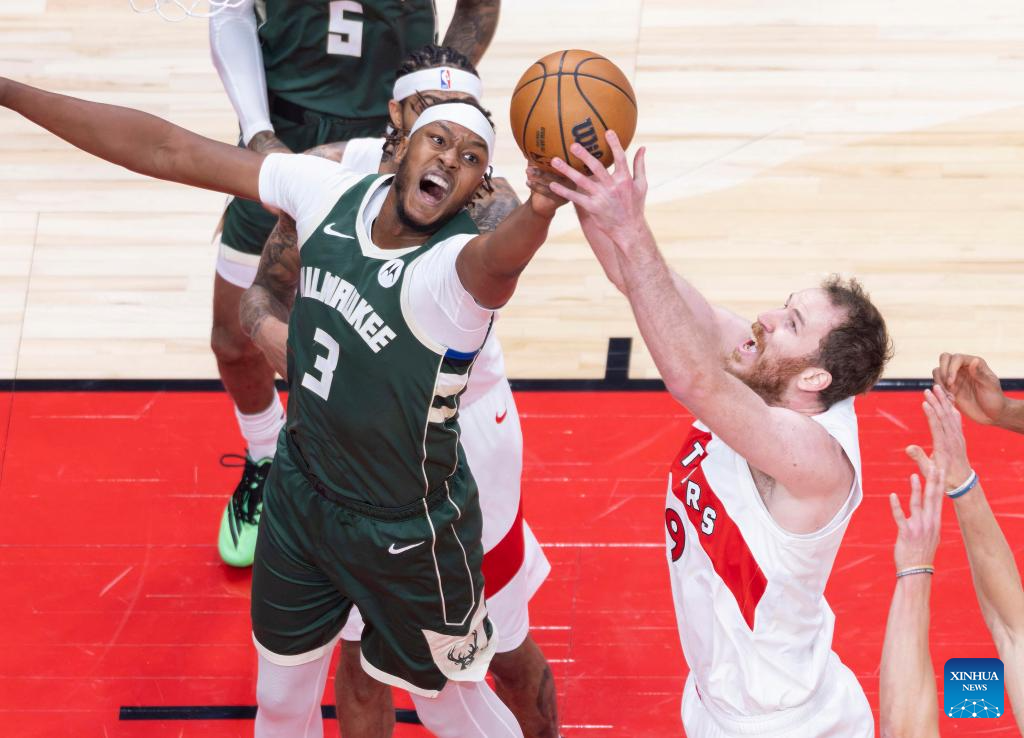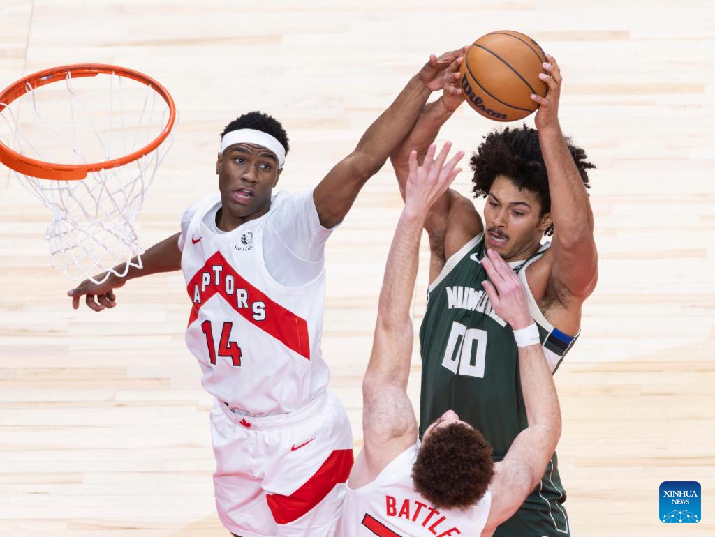 Ja’Kobe Walter (L) of Toronto Raptors fights for a rebound with Jericho Sims of Milwaukee Bucks during the 2025-2026 NBA regular season match between Toronto Raptors and Milwaukee Bucks in Toronto, Canada, on Nov. 4, 2025. (Photo by Zou Zheng/Xinhua)