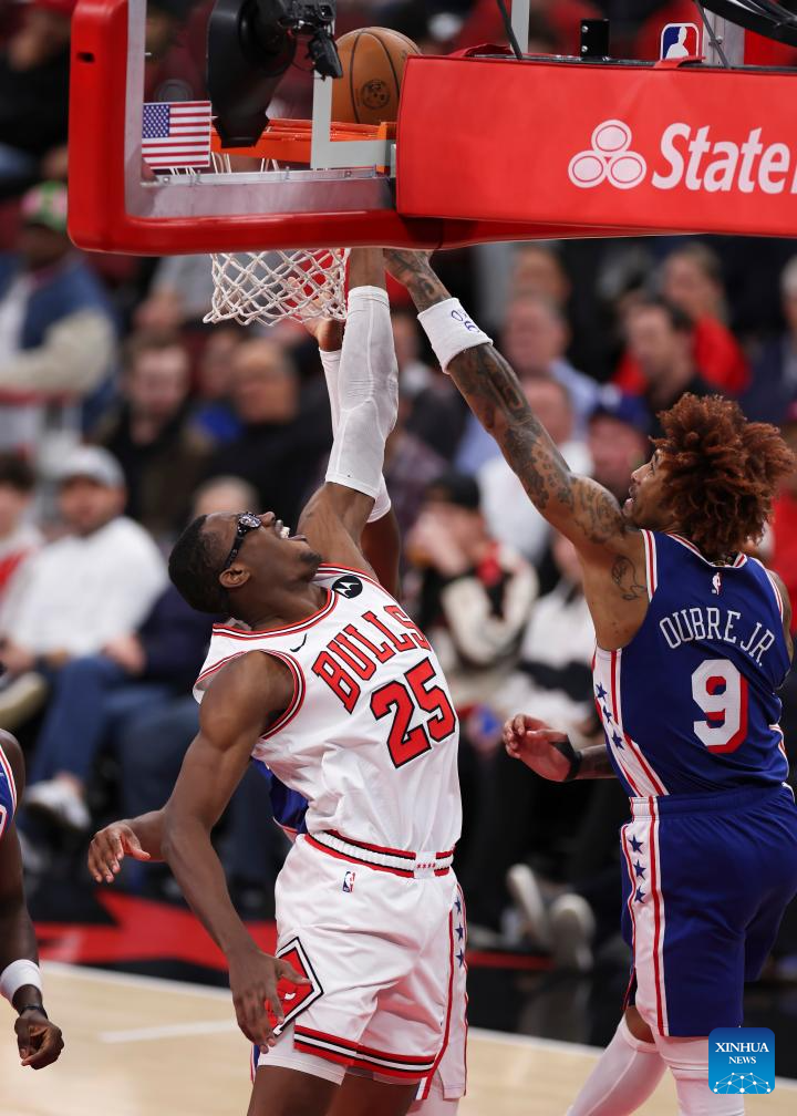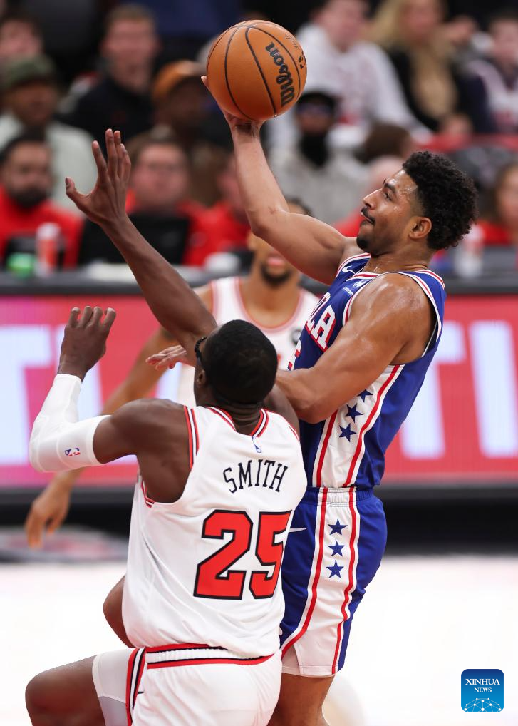 Chicago Bulls’ Jalen Smith (top R) defends Philadelphia 76ers’ Tyrese Maxey (top L) during the 2025-2026 NBA regular season match between Chicago Bulls and Philadelphia 76ers in Chicago, the United States, on Nov. 4, 2025. (Photo by Joel Lerner/Xinhua)