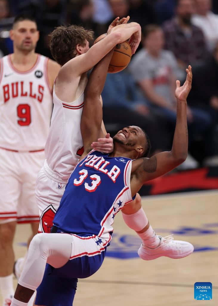 Philadelphia 76ers’ Jabari Walker (bottom) grabs a rebound during the 2025-2026 NBA regular season match between Chicago Bulls and Philadelphia 76ers in Chicago, the United States, on Nov. 4, 2025. (Photo by Joel Lerner/Xinhua)