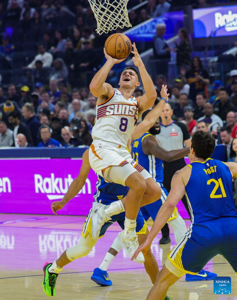 Grayson Allen (L) of Phoenix Suns goes up for a layup during the 2025-2026 NBA regular season match between Phoenix Suns and Golden State Warriors in San Francisco, the United States, on Nov. 4, 2025. (Photo by Dong Xudong/Xinhua)