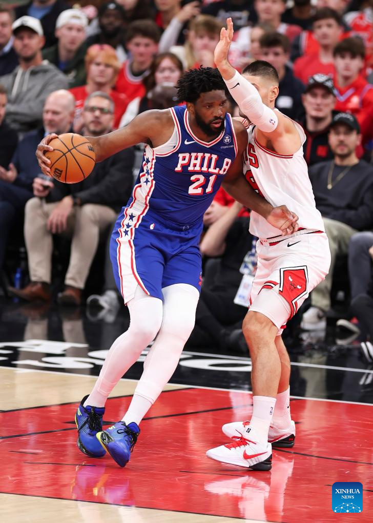 Philadelphia 76ers’ Joel Embiid (L) makes a move on Chicago Bulls’ Nikola Vucevic during the 2025-2026 NBA regular season match between Chicago Bulls and Philadelphia 76ers in Chicago, the United States, on Nov. 4, 2025. (Photo by Joel Lerner/Xinhua)