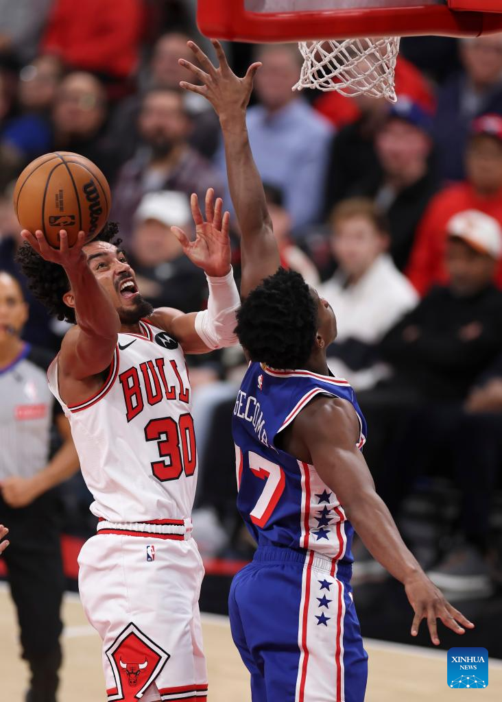 Philadelphia 76ers’ Quentin Grimes (R) drives to the basket during the 2025-2026 NBA regular season match between Chicago Bulls and Philadelphia 76ers in Chicago, the United States, on Nov. 4, 2025. (Photo by Joel Lerner/Xinhua)