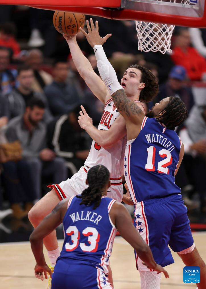 Chicago Bulls’ Josh Giddey (back) goes to the basket during the 2025-2026 NBA regular season match between Chicago Bulls and Philadelphia 76ers in Chicago, the United States, on Nov. 4, 2025. (Photo by Joel Lerner/Xinhua)