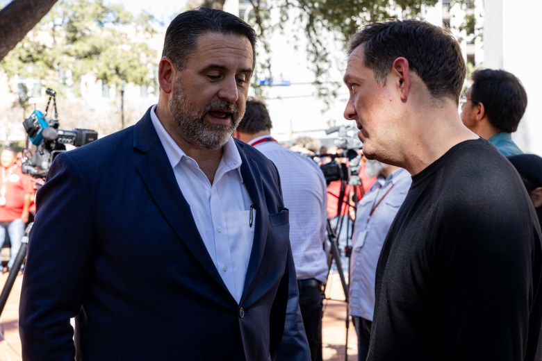 San Antonio City Manager Erik Walsh, left, talks with Spurs Managing Partner Peter J. Holt after a press conference in front of City Hall on Wednesday. Credit: Amber Esparza / San Antonio Report
