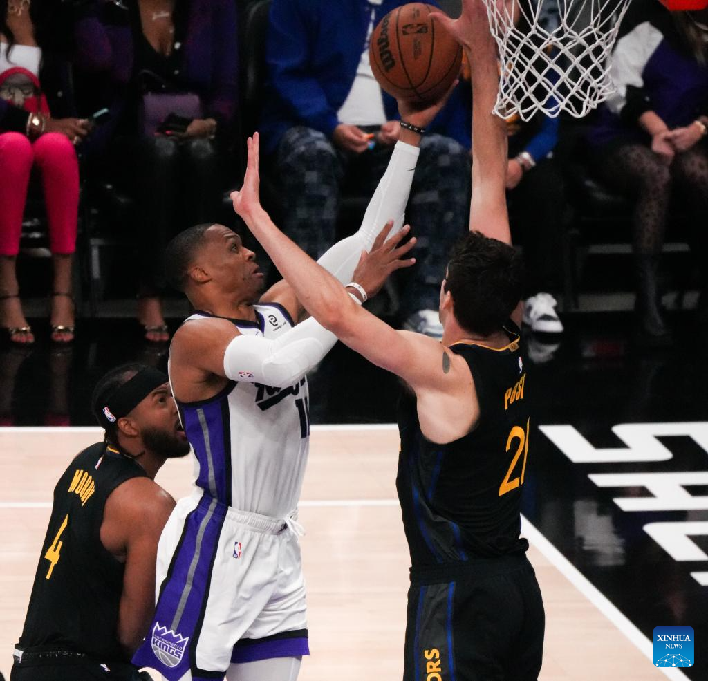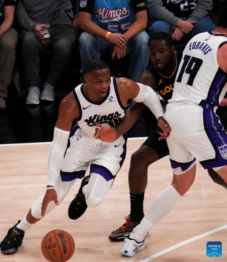Russell Westbrook (L) of Sacramento Kings breaks through during the 2025-2026 NBA regular season match between Sacramento Kings and Golden State Warriors in Sacramento, the United States, Nov. 5, 2025. (Photo by Sun Yuxuan/Xinhua)