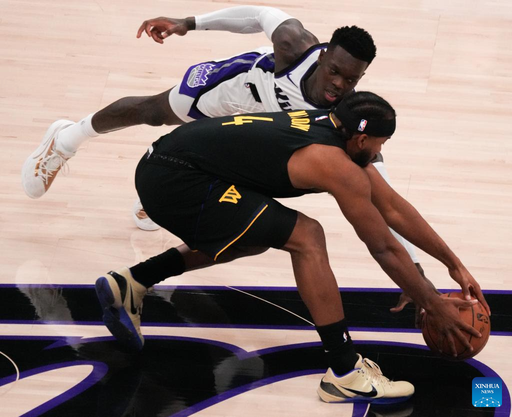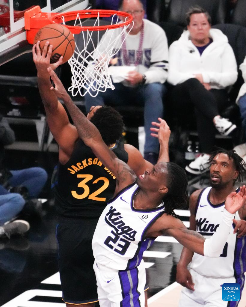 Moses Moody (R) of Golden State Warriors vies for the ball during the 2025-2026 NBA regular season match between Sacramento Kings and Golden State Warriors in Sacramento, the United States, Nov. 5, 2025. (Photo by Sun Yuxuan/Xinhua)