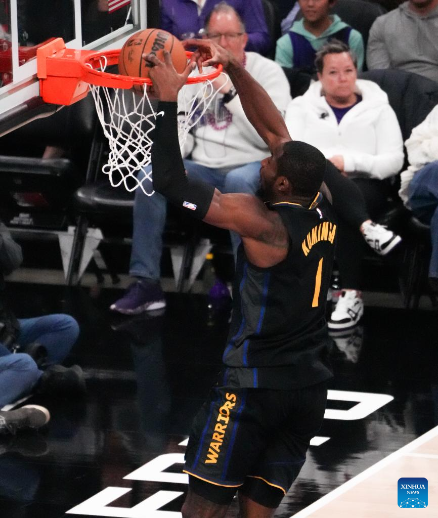 Jonathan Kuminga of Golden State Warriors dunks during the 2025-2026 NBA regular season match between Sacramento Kings and Golden State Warriors in Sacramento, the United States, Nov. 5, 2025. (Photo by Sun Yuxuan/Xinhua)