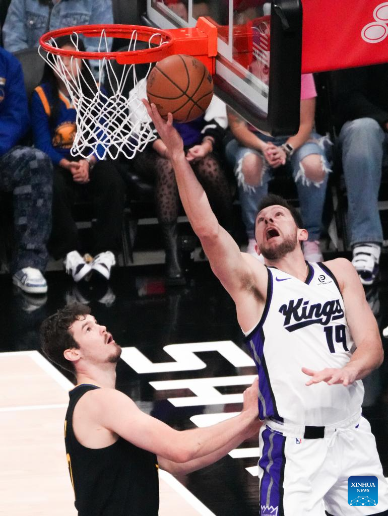 Drew Eubanks (R) of Sacramento Kings goes for a layup during the 2025-2026 NBA regular season match between Sacramento Kings and Golden State Warriors in Sacramento, the United States, Nov. 5, 2025. (Photo by Sun Yuxuan/Xinhua)
