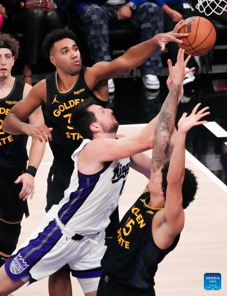 Gui Santos (C) of Golden State Warriors vies for the ball during the 2025-2026 NBA regular season match between Sacramento Kings and Golden State Warriors in Sacramento, the United States, Nov. 5, 2025. (Photo by Sun Yuxuan/Xinhua)