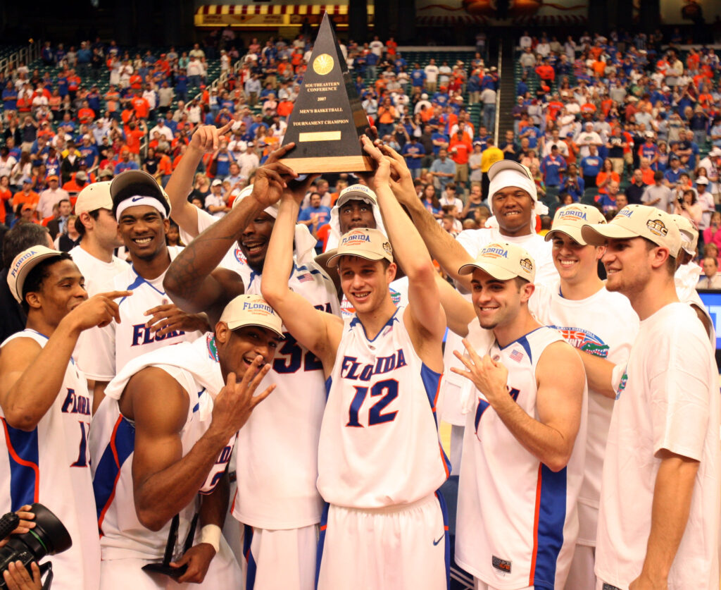 Mar 11, 2007; Atlanta, GA, USA; Florida Gators players hold up the championship trophy after the Gators defeated the Arkansas Razorbacks 77-56 to win the SEC Tournament championship game at the Georgia Dome in Atlanta, GA. Credit: Jason Parkhurst-USA TODAY Sports Copyright: 2007 Jason Parkhurst