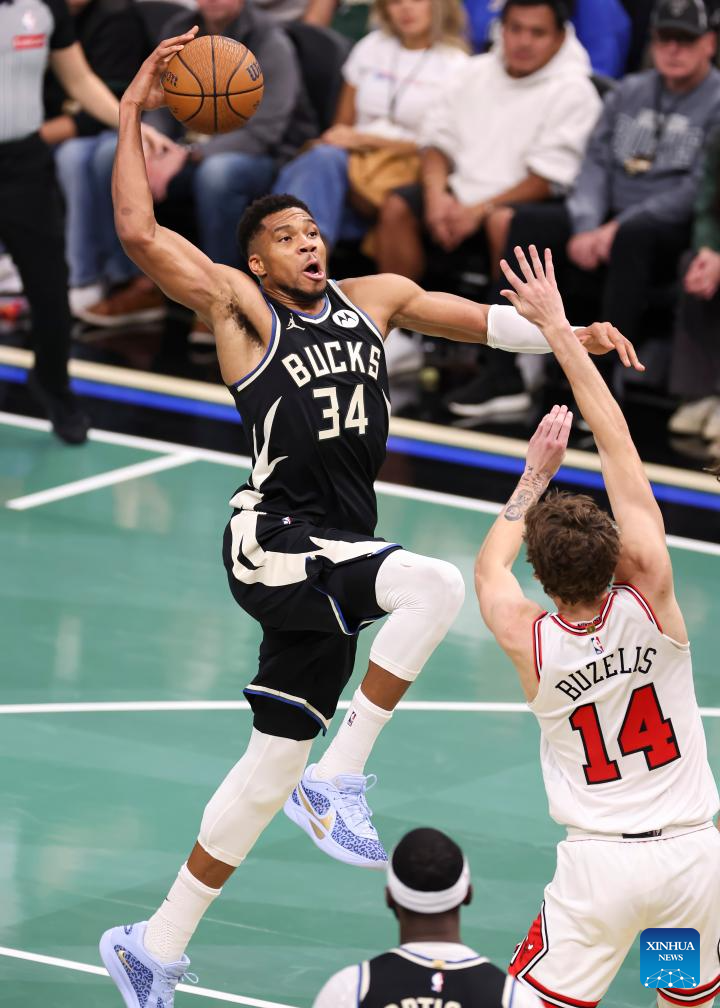 Chicago Bulls’ Ayo Dosunmu (R) vies with Milwaukee Bucks’ Giannis Antetokounmpo during the 2025-2026 NBA regular season game between Milwaukee Bucks and Chicago Bulls in Milwaukee, the United States, on Nov. 7, 2025. (Photo by Joel Lerner/Xinhua)