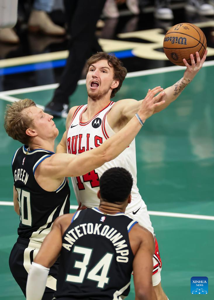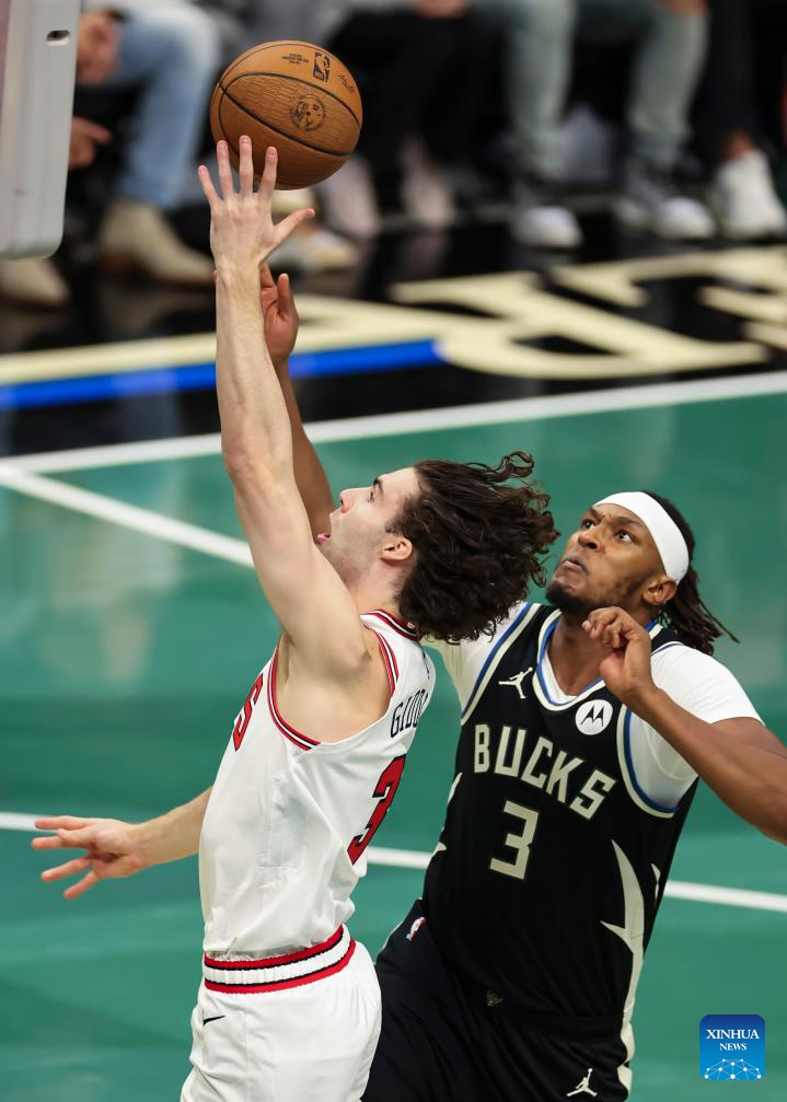 Chicago Bulls’ Josh Giddey (L) goes for a layup during the 2025-2026 NBA regular season game between Milwaukee Bucks and Chicago Bulls in Milwaukee, the United States, on Nov. 7, 2025. (Photo by Joel Lerner/Xinhua)