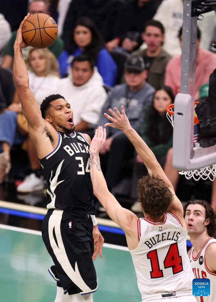 Milwaukee Bucks’ Giannis Antetokounmpo (L) dunks during the 2025-2026 NBA regular season game between Milwaukee Bucks and Chicago Bulls in Milwaukee, the United States, on Nov. 7, 2025. (Photo by Joel Lerner/Xinhua)
