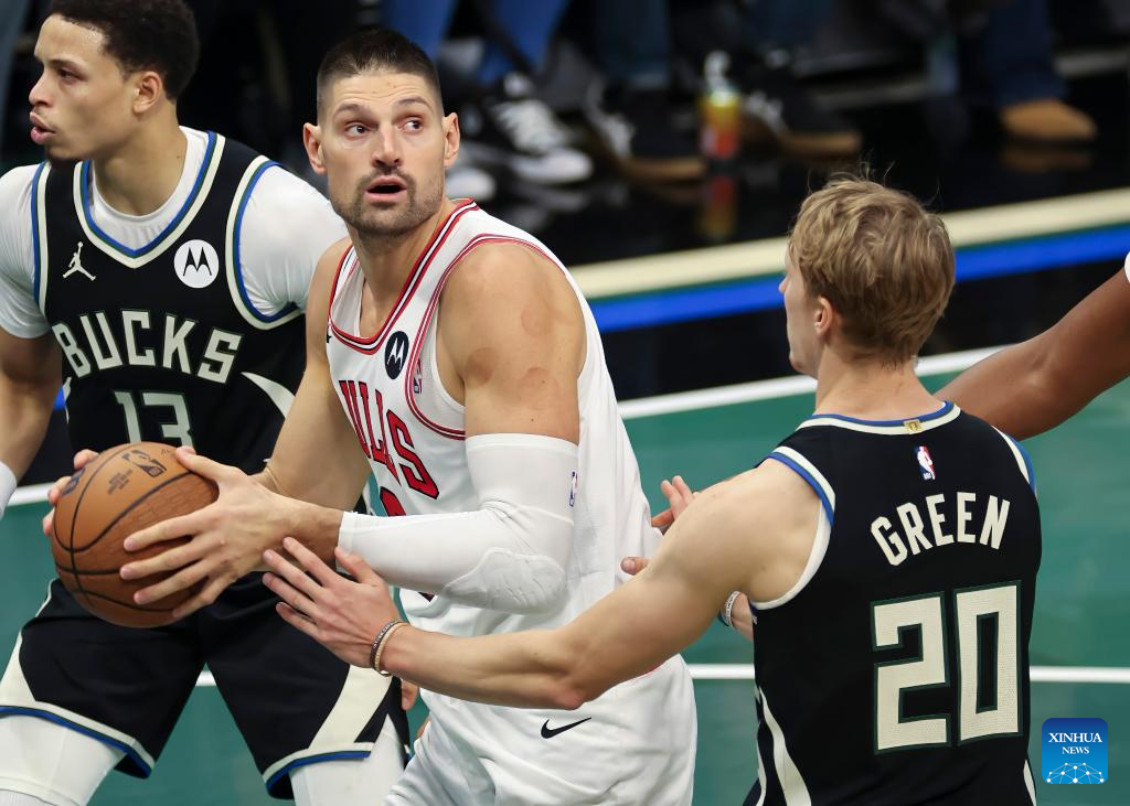 Chicago Bulls’ Nikola Vucevic (C) competes during the 2025-2026 NBA regular season game between Milwaukee Bucks and Chicago Bulls in Milwaukee, the United States, on Nov. 7, 2025. (Photo by Joel Lerner/Xinhua)