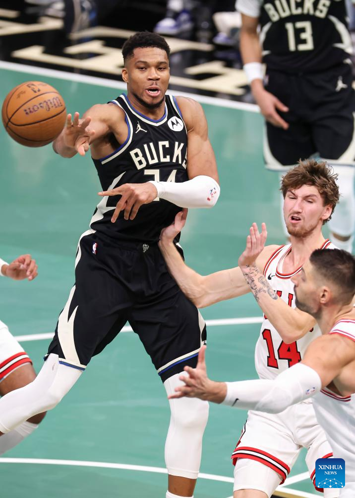 Milwaukee Bucks’ Giannis Antetokounmpo (L) passes the ball during the 2025-2026 NBA regular season game between Milwaukee Bucks and Chicago Bulls in Milwaukee, the United States, on Nov. 7, 2025. (Photo by Joel Lerner/Xinhua)