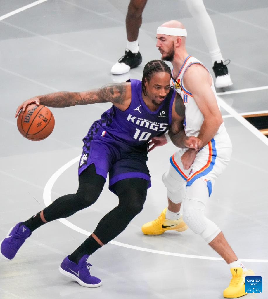 DeMar DeRozan (L) of Sacramento Kings competes during the 2025-2026 NBA regular season match between Sacramento Kings and Oklahoma City Thunder in Sacramento, the United States, Nov. 7, 2025. (Photo by Sun Yuxuan/Xinhua)