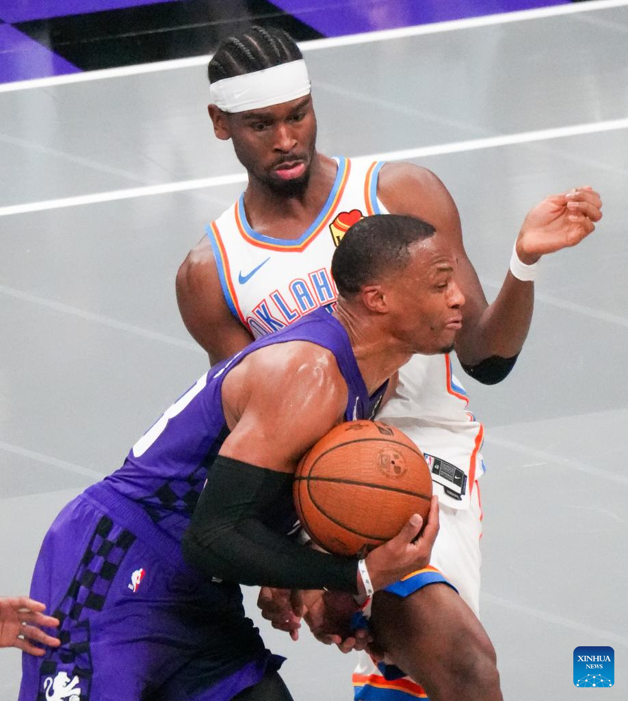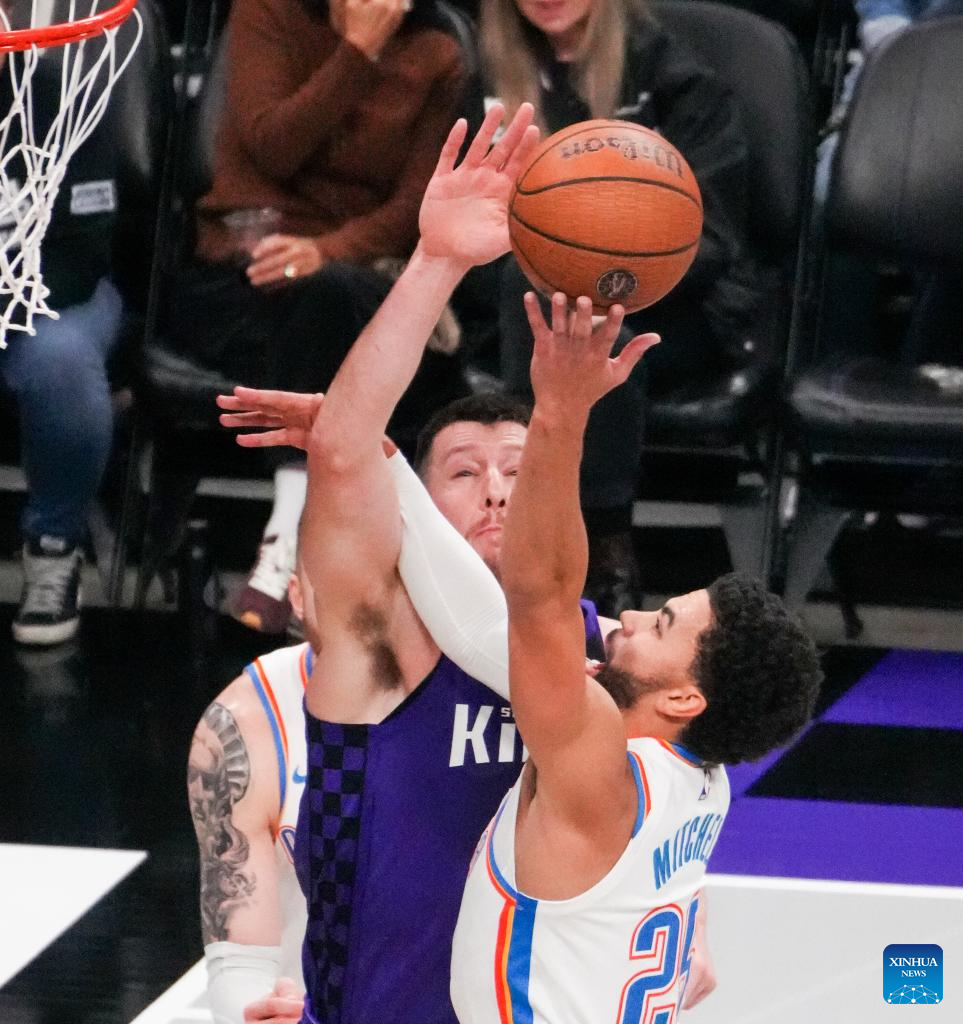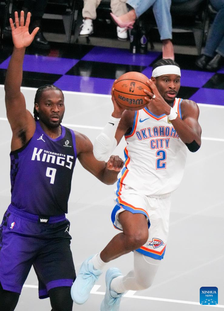 Shai Gilgeous-Alexander (R) of Oklahoma City Thunder competes during the 2025-2026 NBA regular season match between Sacramento Kings and Oklahoma City Thunder in Sacramento, the United States, Nov. 7, 2025. (Photo by Sun Yuxuan/Xinhua)