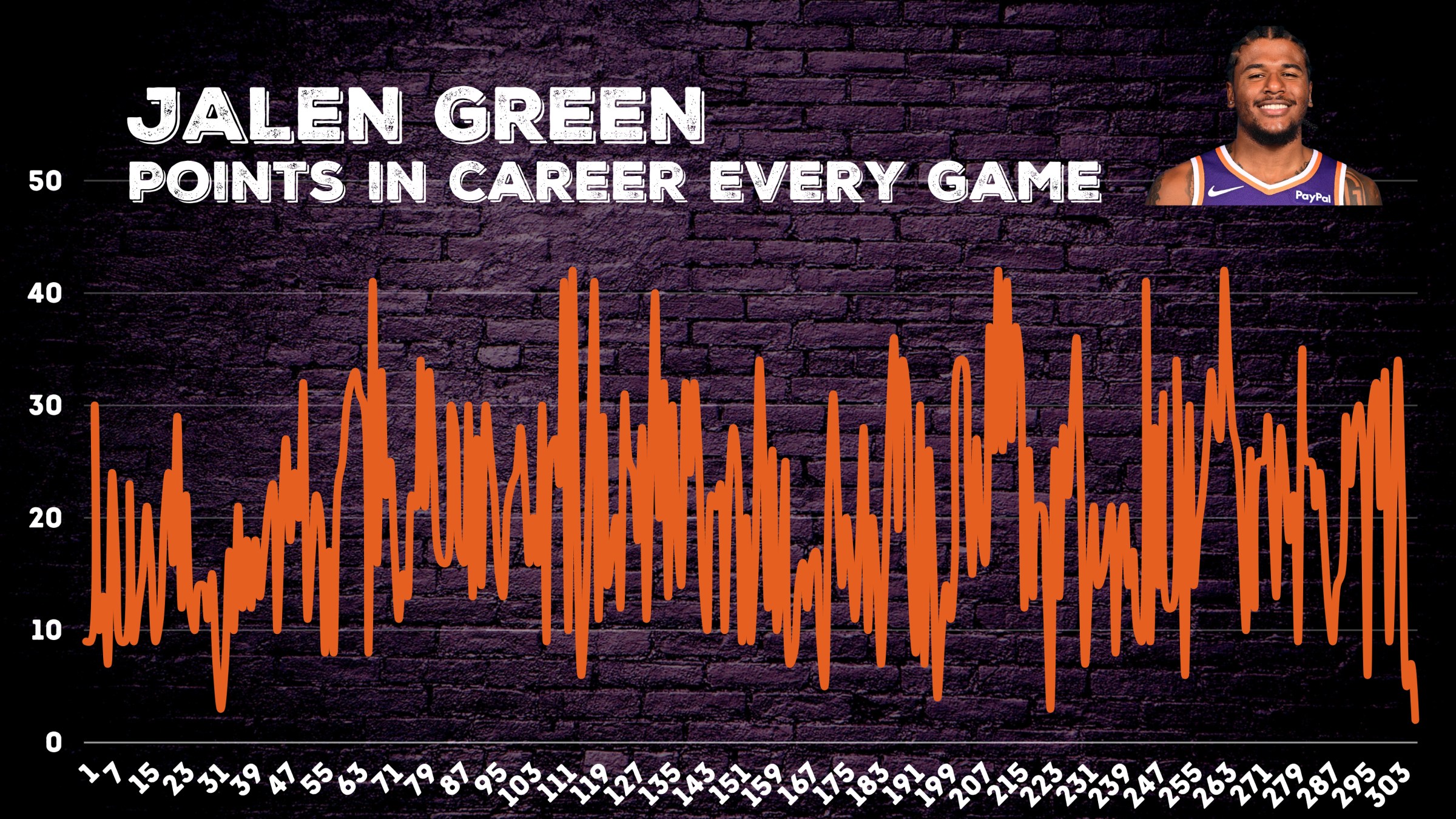 I did a little digging, combing through every game Jalen Green played in his four years with Houston. I charted his scoring totals, probably to a level no sane person should, and what I found backed up everything Rockets fans were saying. When you look at his game-by-game points, the pattern jumps out right away. It looks kind of like an EKG of your heartbeat during a Suns’ game.