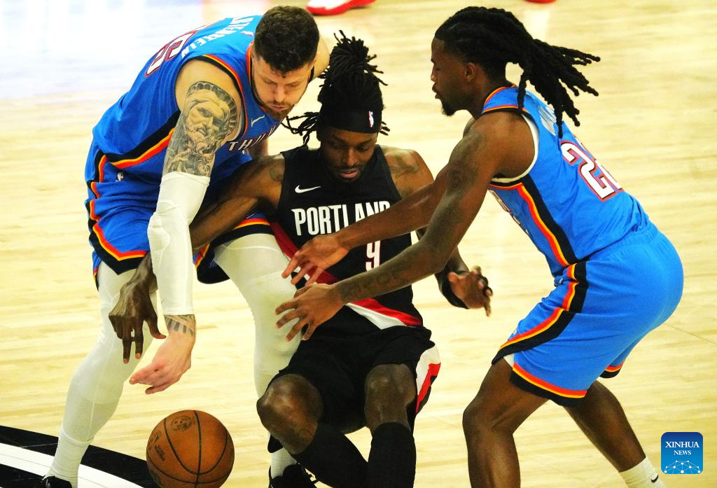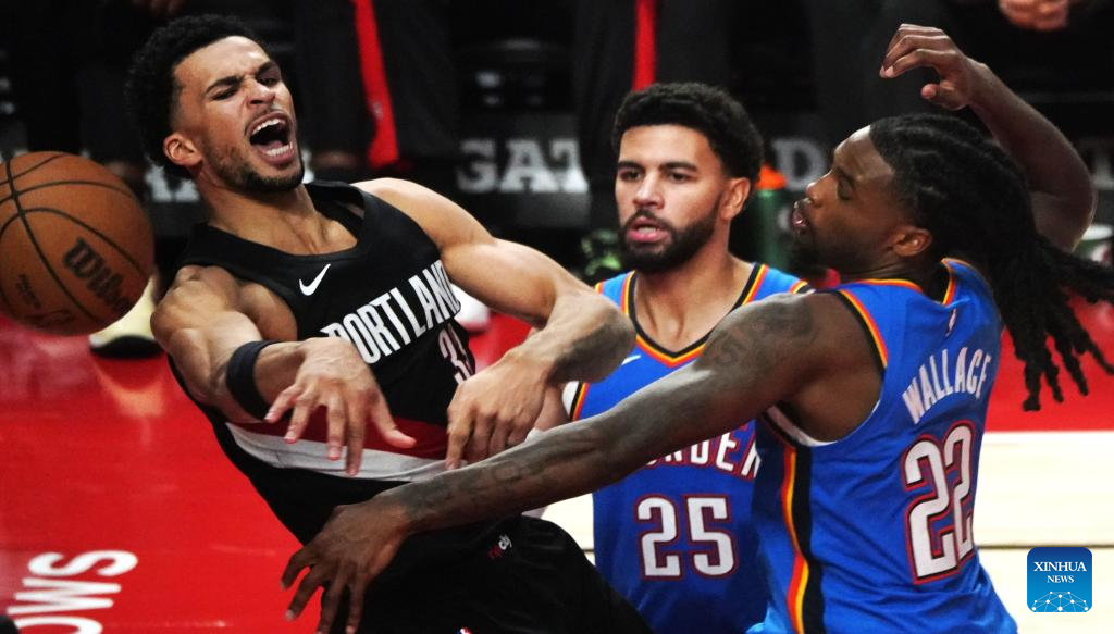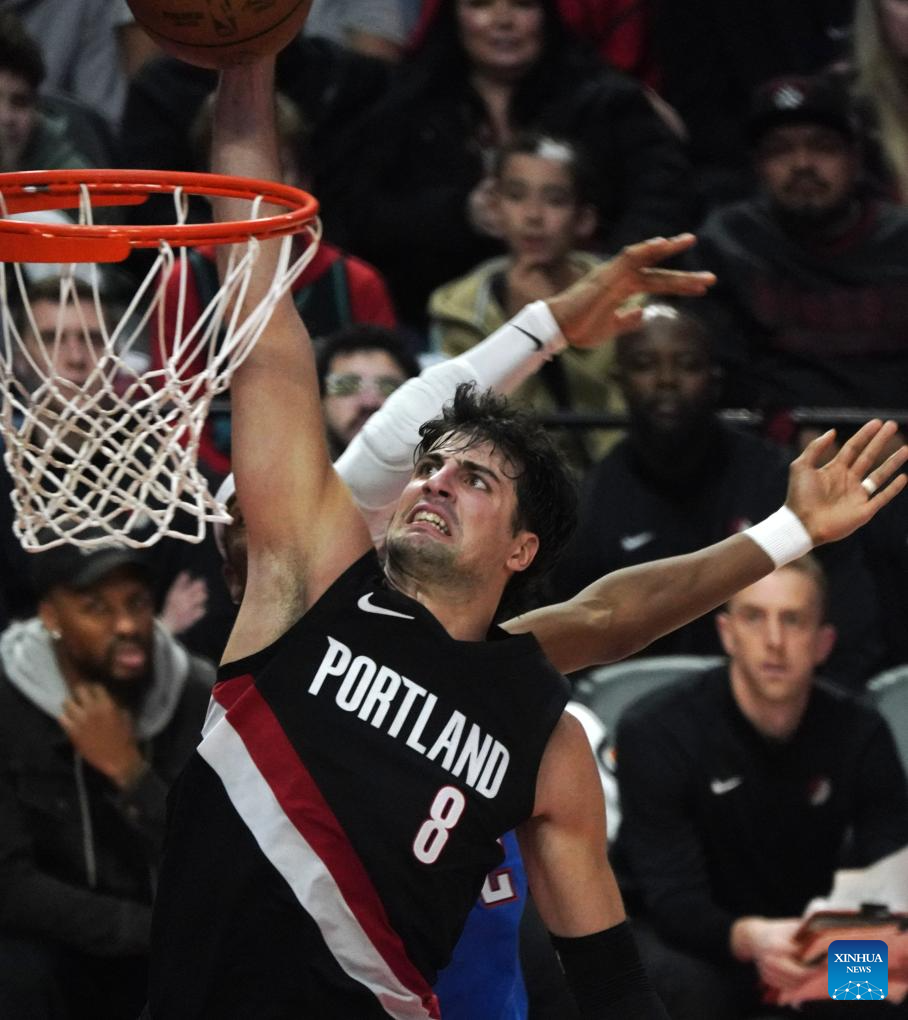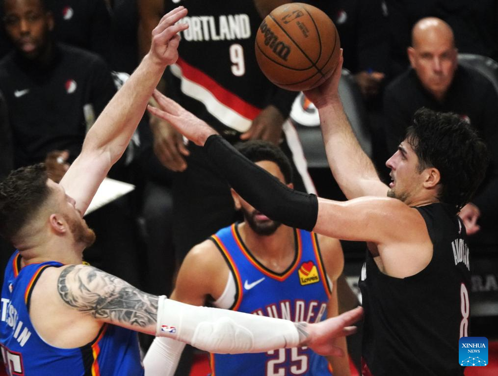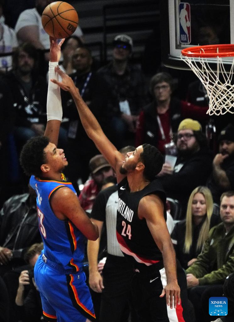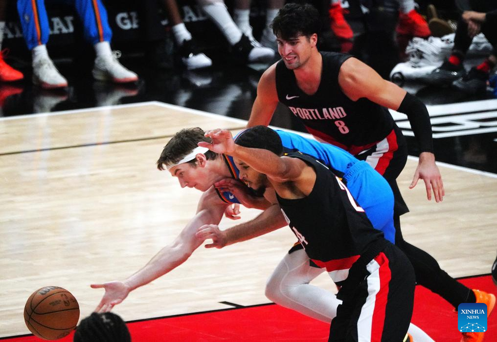 Deni Avdija (C) of Portland Trail Blazers competes during the 2025-2026 NBA regular season match between Portland Trail Blazers and Oklahoma City Thunders in Portland, the United States, Nov. 5, 2025. (Xinhua/Wu Xiaoling)