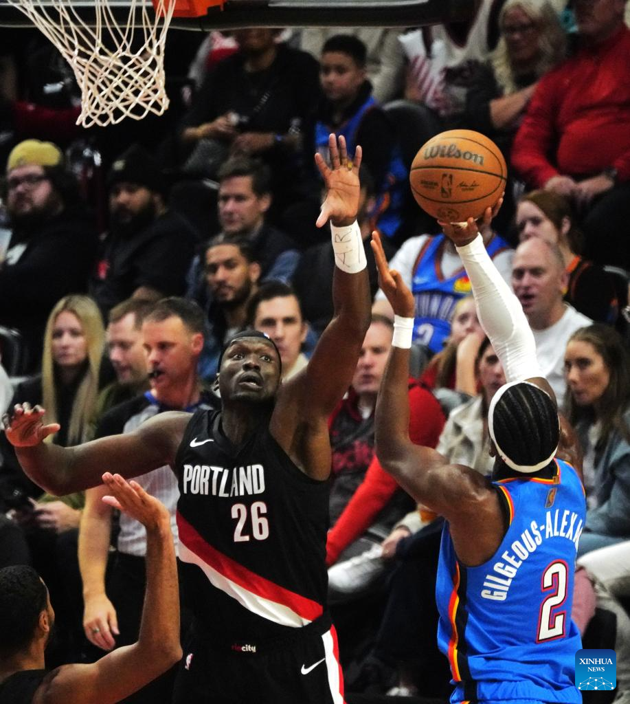 Duop Reath (L) of Portland Trail Blazers defends Shai Gilgeous-Alexander of Oklahoma City Thunders during the 2025-2026 NBA regular season match between Portland Trail Blazers and Oklahoma City Thunders in Portland, the United States, Nov. 5, 2025. (Xinhua/Wu Xiaoling)