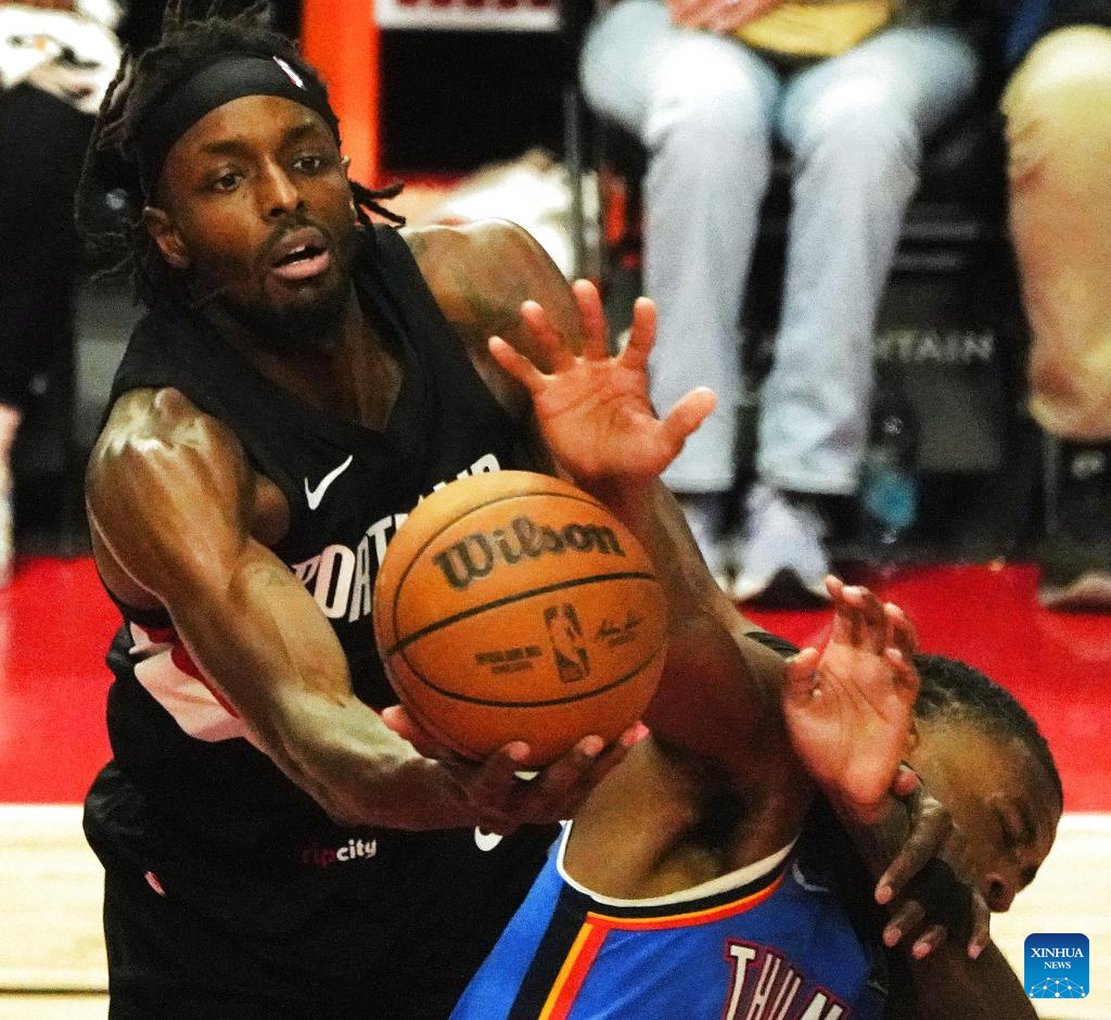 Jerami Grant (C) of Portland Trail Blazers competes during the 2025-2026 NBA regular season match between Portland Trail Blazers and Oklahoma City Thunders in Portland, the United States, Nov. 5, 2025. (Xinhua/Wu Xiaoling)