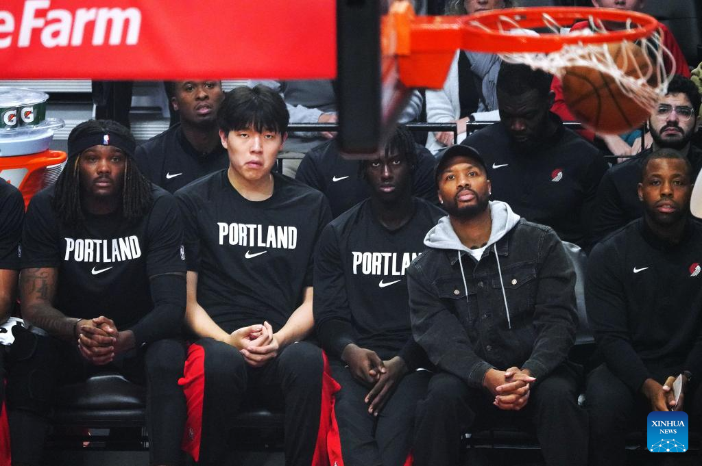 Yang Hansen (2nd L) of Portland Trail Blazers watches the 2025-2026 NBA regular season match between Portland Trail Blazers and Oklahoma City Thunders in Portland, the United States, Nov. 5, 2025. (Xinhua/Wu Xiaoling)