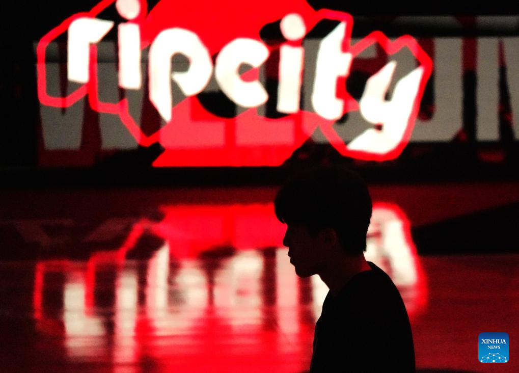 Yang Hansen of Portland Trail Blazers reacts before the 2025-2026 NBA regular season match between Portland Trail Blazers and Oklahoma City Thunders in Portland, the United States, Nov. 5, 2025. (Xinhua/Wu Xiaoling)