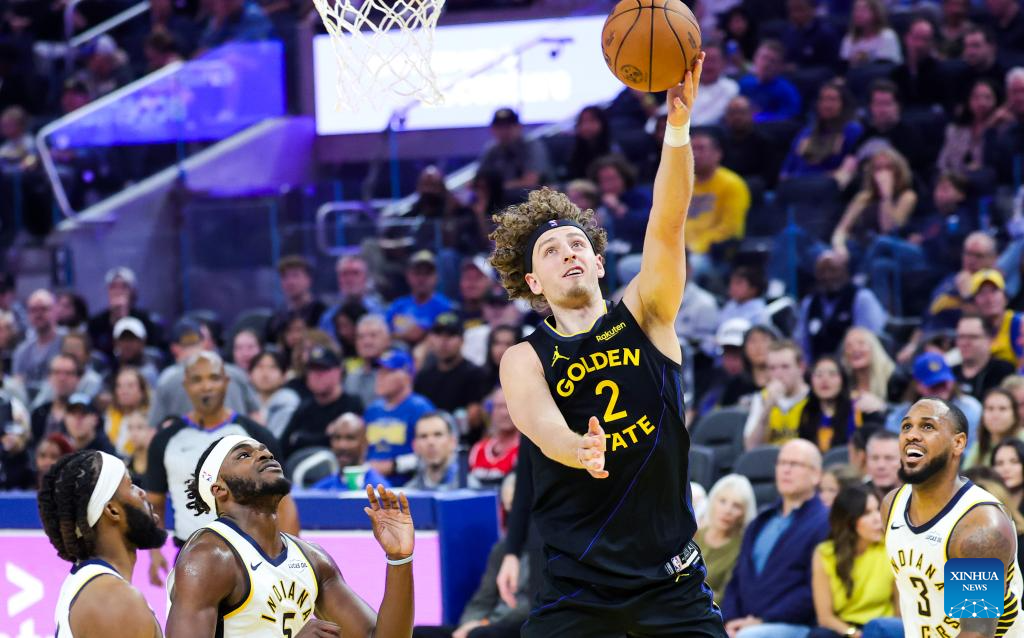 Pat Spencer (R) of Golden State Warriors competes during the 2025-2026 NBA regular season match between Golden State Warriors and Indiana Pacers in San Francisco, the United States, on Nov. 9, 2025. (Photo by Arthur Dong/Xinhua)