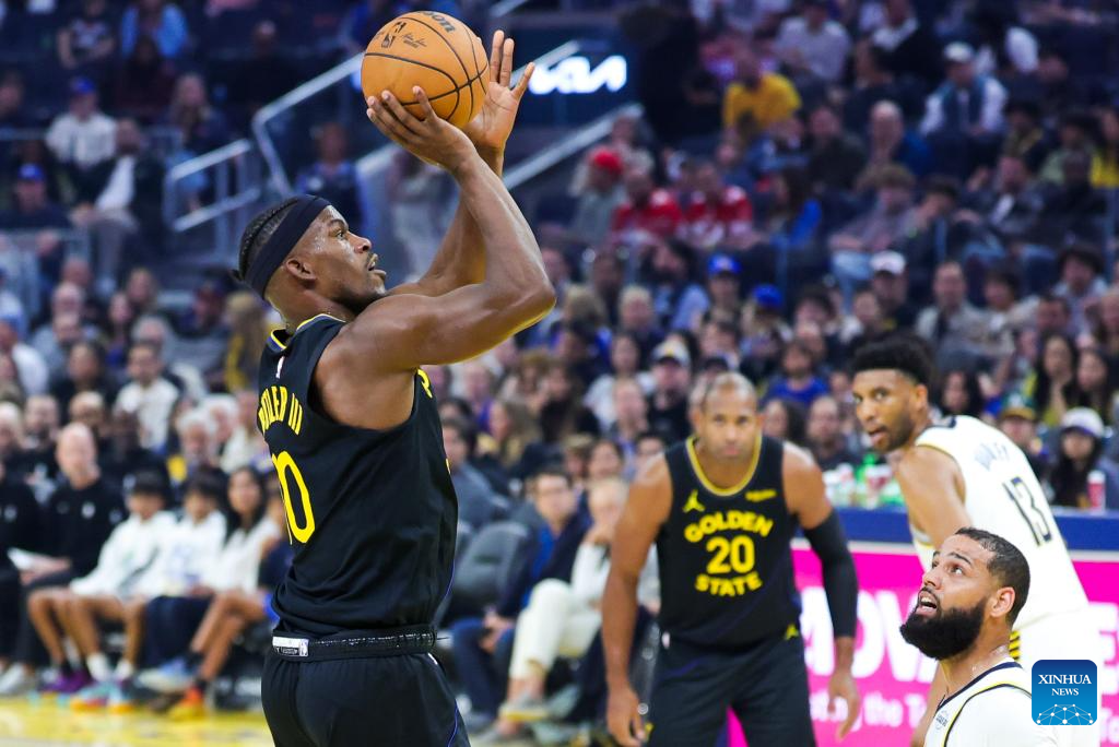 Jimmy Butler III (1st R) of Golden State Warriors goes for a layup during the 2025-2026 NBA regular season match between Golden State Warriors and Indiana Pacers in San Francisco, the United States, on Nov. 9, 2025. (Photo by Arthur Dong/Xinhua)