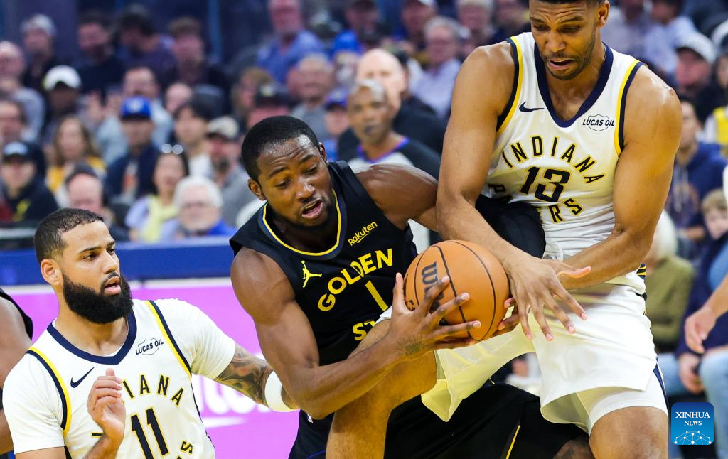 Quinten Post (front L) of Golden State Warriors competes during the 2025-2026 NBA regular season match between Golden State Warriors and Indiana Pacers in San Francisco, the United States, on Nov. 9, 2025. (Photo by Arthur Dong/Xinhua)