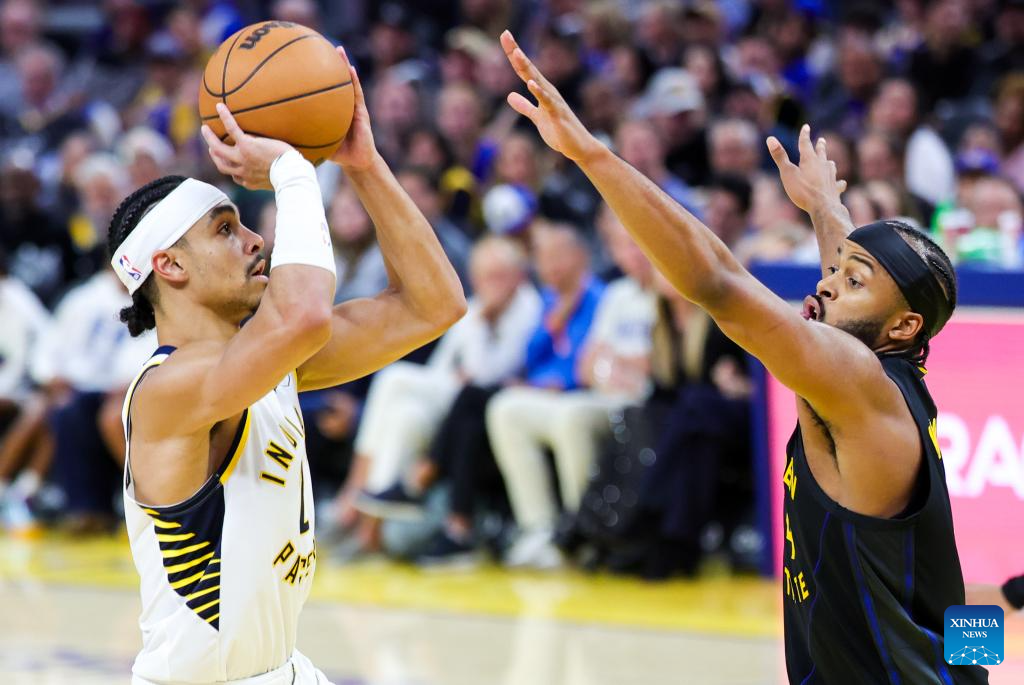 Moses Moody (R) of Golden State Warriors defends during the 2025-2026 NBA regular season match between Golden State Warriors and Indiana Pacers in San Francisco, the United States, on Nov. 9, 2025. (Photo by Arthur Dong/Xinhua)