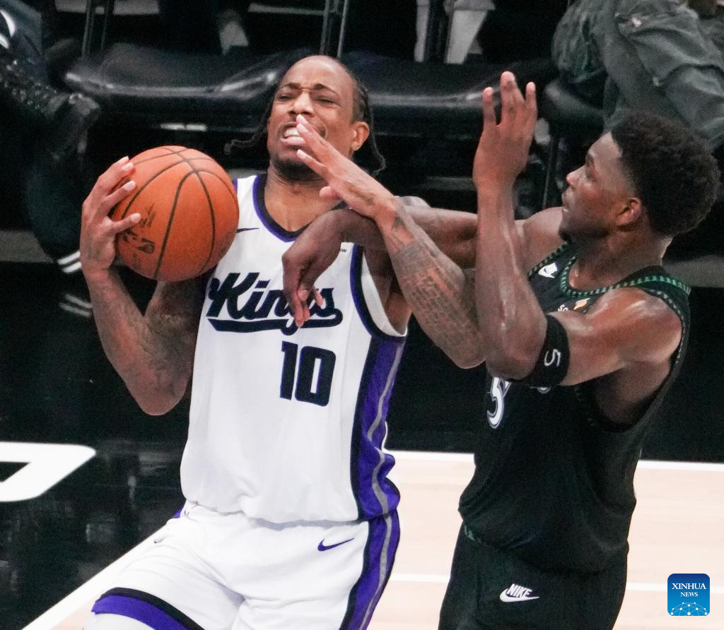 DeMar DeRozan (R) of Sacramento Kings defends during the 2025-2026 NBA regular season match between Sacramento Kings and Minnesota Timberwolves in Sacramento, the United States, Nov. 9, 2025. (Photo by Sun Yuxuan/Xinhua)